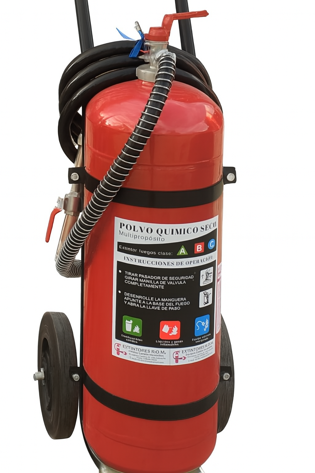 El extintor PQS de 25 kg es un equipo multipropósito de polvo químico seco capaz de combatir incendios de clase A, B y C, ideal para grandes espacios industriales, comerciales y bodegas, proporcionando alta eficacia y movilidad gracias a su diseño rodante.