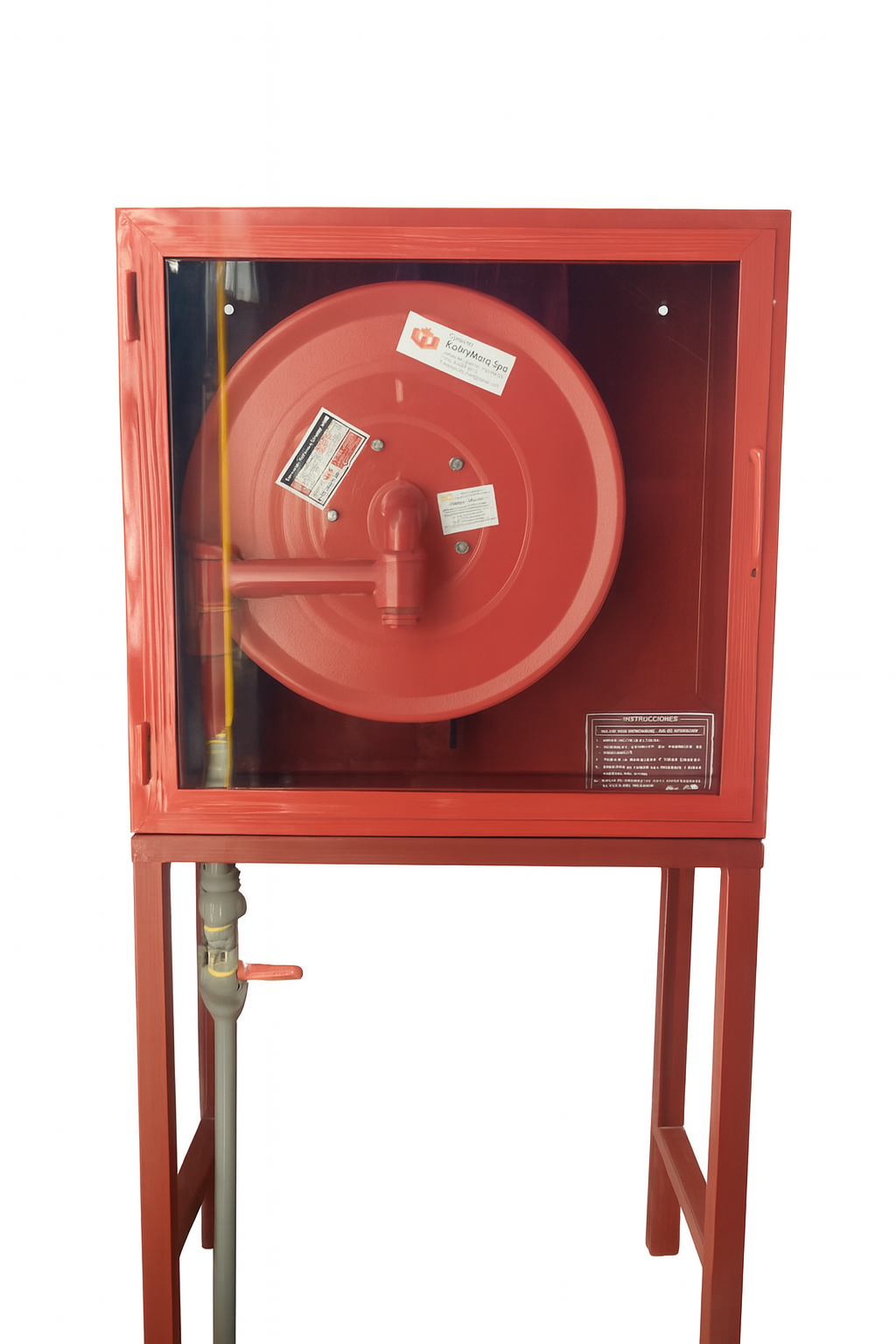 Gabinete Red Húmeda contra incendio, fabricados en placa de acero de 1mm a 1.2 mm de espesor, puerta abatible en 180 grados, tirador y cierre mecánico, pintura electroestática color rojo, con carrete interior giratorio y abatible, puede ser en 25 o 30 metros de manguera de incendio semi rígida de 1″ o 1.1/2”, Posee un sistema de grifería interna que permite el paso del agua en forma constante a través del eje, sin necesidad de desenrollar la manguera, cuenta con un pitón neblinero.